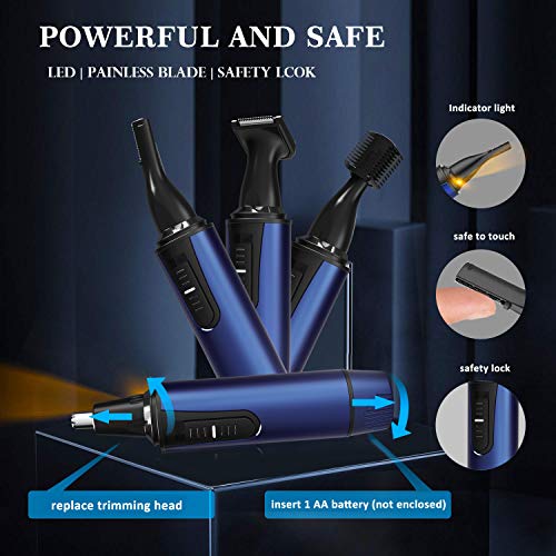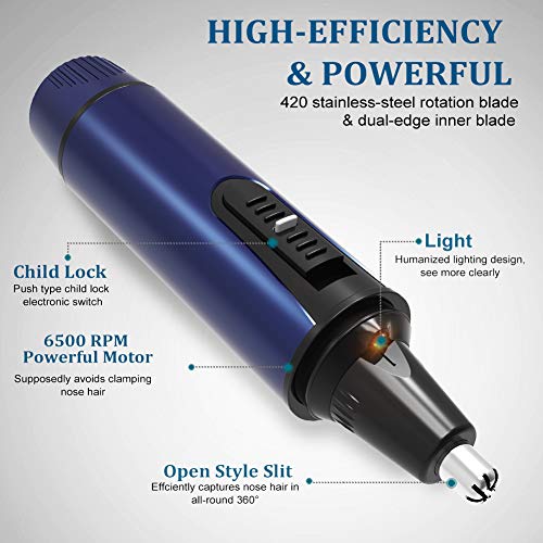 【POWERFUL AND SAFE】: This ear hair trimmer features 6500RPM powerful motor and dual-dual-edge blade, precisely removes the hairs without painful and unpleasant pulling.; Bright led lights make you see more clearly; Push-type child lock electronic switch to eliminate baby’s mistaken safety risk.